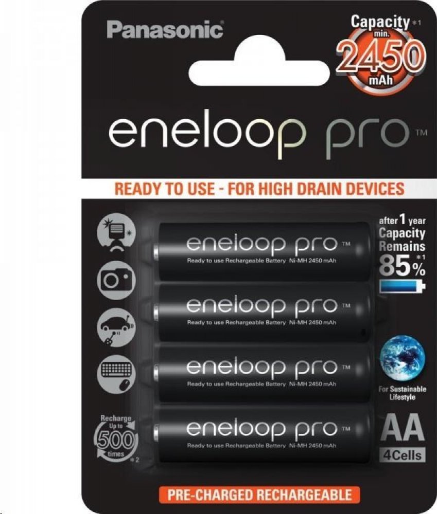 Jedinečné tužkové baterie AA (R6) které spojují výhody Eneloop, alkalických a díky vysoké kapacitě i klasických NiMh baterií. Jako jediná baterie tohoto typu nabízí kapacitu min. 2500mAh (běžně ale 2550mAh) při 500 dobíjecích cyklech. I tyto baterie mají samozřejmě maximálně eliminovaný efekt samovybíjení. Díky speciální technologii udrží tyto baterie po dobu jednoho roku až 85% své kapacity. Baterie Eneloop PRO se dodávají v nabitém stavu a jsou připraveny k okamžitému použití.