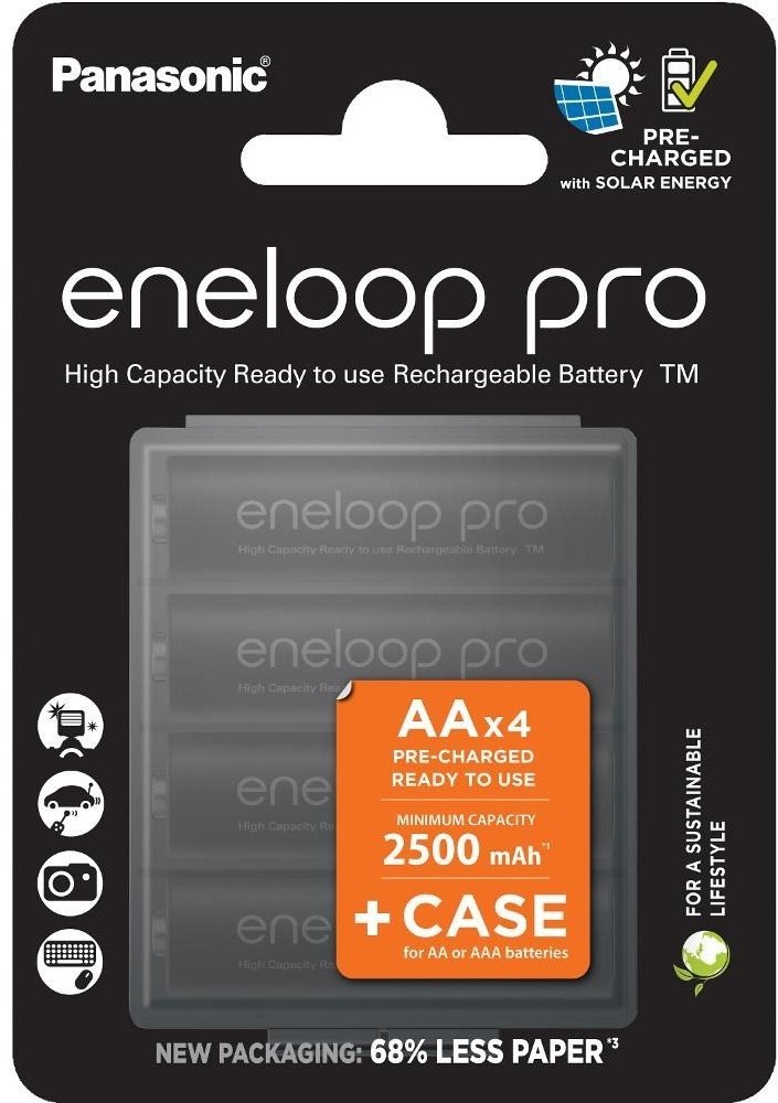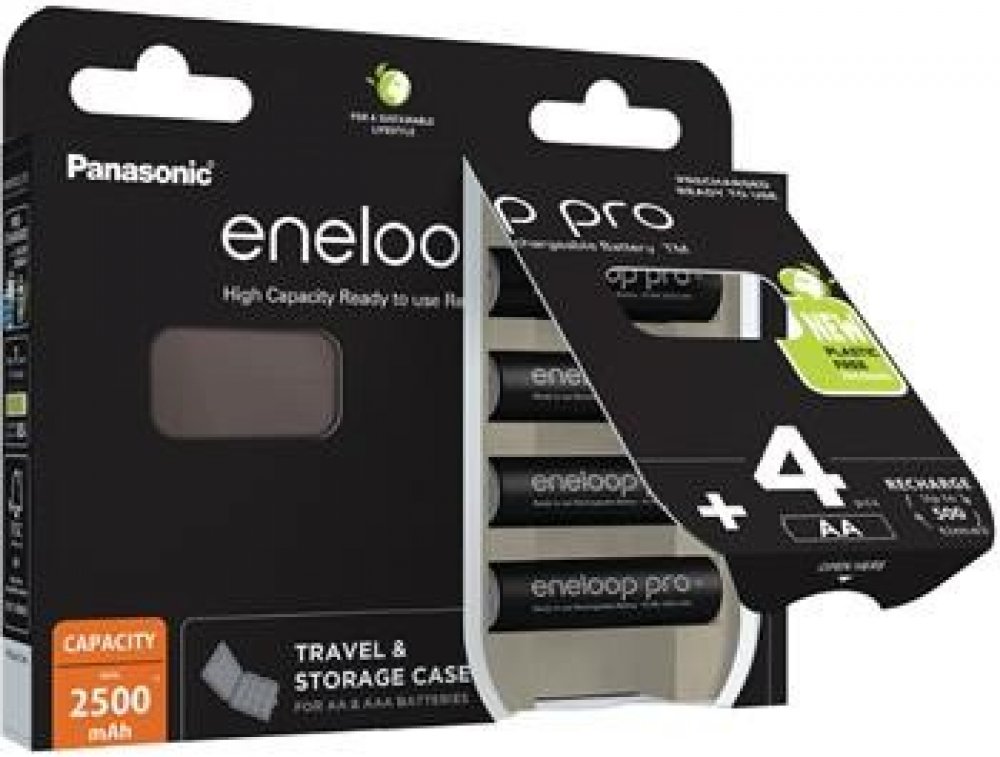 Toto balení Eneloop pro obsahuje 4 baterie AA a pouzdro pro snadné skladování.