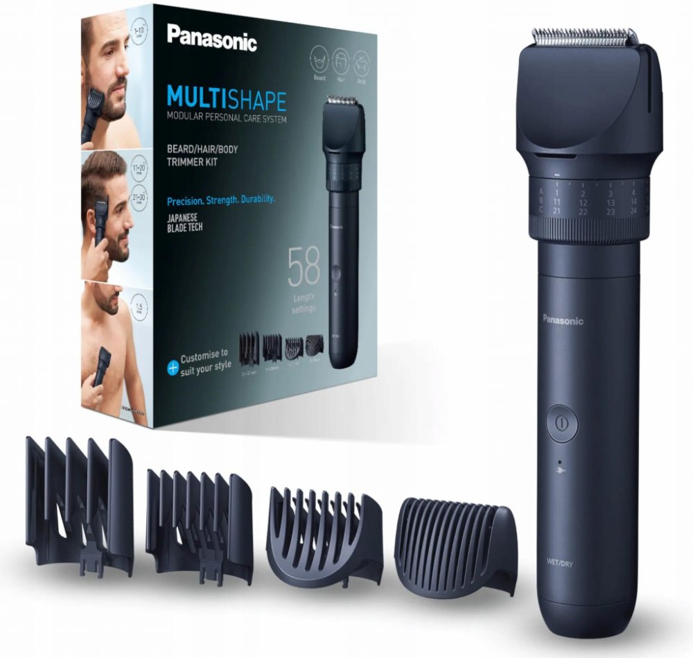 Zastřihovač vlasů, vousů a chloupků Panasonic MultiShape ER-CKN2-A301 Modulární systém osobní péče MULTISHAPE na vlasy, vousy a tělo Široká zastřihovací hlavice Břity z japonské nerezové oceli ostřenými nanotechnologií pod úhlem 45 ˚ Nastavení 58 délek střihu (0,5 až 30 mm v intervalech po 0,5 mm) otočným voličem 4 zastřihovací nástavce WET & DRY – použití na sucho nebo s gelem či pěnou – dokonce ...