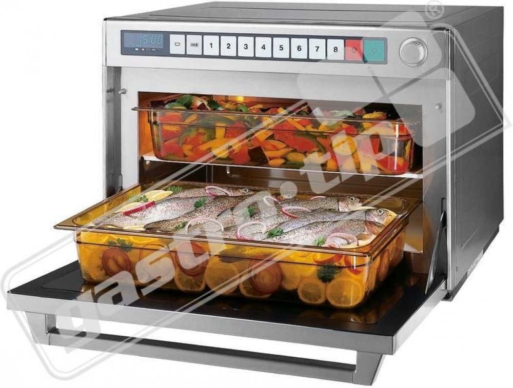 Robusní konstrukce, velký výkon a rozsáhlá kapacita. To je důležité, aby se na výstupu udržely stálé hodnoty. Hodí se pro použití v nemocnicích, ve společnostech zabývajících se výrobou jídla, pro catering, ve velkých restauracích či hotelích. čtyřsměrné křížové vyzařování, čtyři magnetrony a rotující vodící plochy vln jsou určeny pro rychlé a rovnoměrné ohřívání. čtyři úrovně výkonu: vysoký, střední, nízký a rozmrazování. Jednotka i vnitřní dutiny jsou vyrobeny z nerez oceli, určené pro velké zatížení. Snadné čištění hladkého povrchu interiéru s odnímatelným vnitřním regálem. číselný displej. tahem vyklápějící se dvířka (směrem dolů)