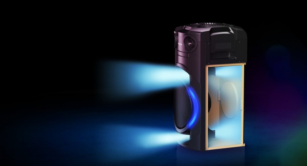 Modré LED podsvícení okolo reproduktoru vykouzlí nezapomenutelnou atmosféru při libovolné příležitosti. Velikost reproduktoru je 28,5×58,5×30,3 cm a hmotnost 10,2 kg.