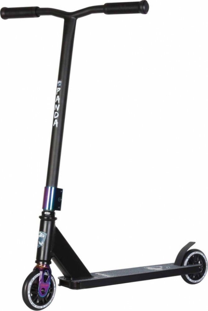 Výborná lehká koloběžka ideální pro začátečníky. Díky T řídítkům z oceli se snadno naučíte triky jako no hand, barspin atd. Lehká deska s obdélníkovým tvarem je super pro naučení základních grind triků. (lépe drží na povrchu překážky). 110mm kolečka mají plastový střed. Vidlice je ocelová se závitovým headsetem. Výborná do skateparku.