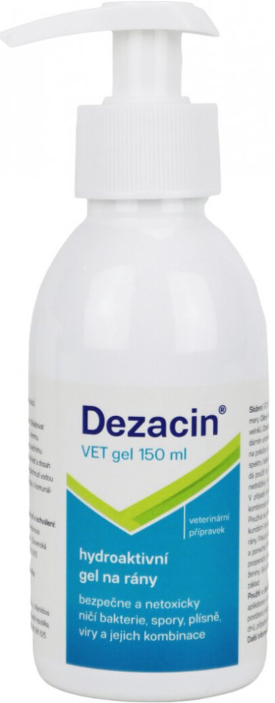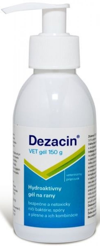 Popis: Dezacin VET gel je dezinfekční přípravek určený pro veterinární použití. Obsahuje stabilizovaný oxid chloričitý, který působí antisepticky a podporuje regeneraci tkání. Gelová forma umožňuje snadnou aplikaci na postižená místa, kde vytváří ochranný film a prodlužuje účinek účinné látky.