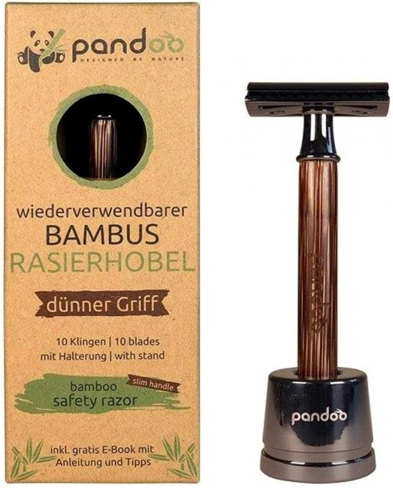 Pandoo Bambusový holicí strojek se stojanem a 10 ks žiletek tenká rukojeť