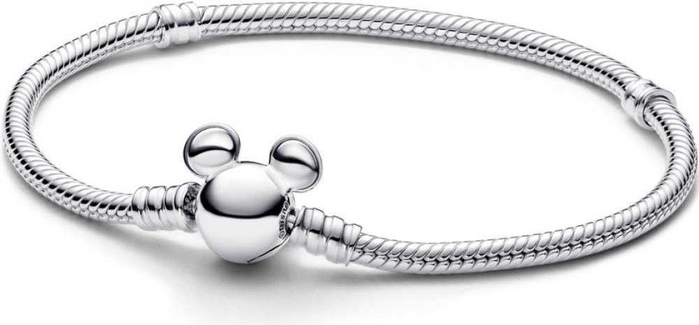 Noste svou sbírku přívěsků PANDORA Disney x Pandora na hadovitém řetízkovém náramku se sponou PANDORA Disney Mickey Mouse. Tento hadovitý řetízkový náramek ze sterlingového stříbra zdobí spona inspirovaná ikonickou siluetou hlavy Mickey Mouse. Sponu snadno otevřete a zavřete stisknutím Mickeyho uší proti sobě. Náramek má dva závity (vyvýšené oddělovače přívěsků) a pojme 16-18 přívěsků nebo visacíc...