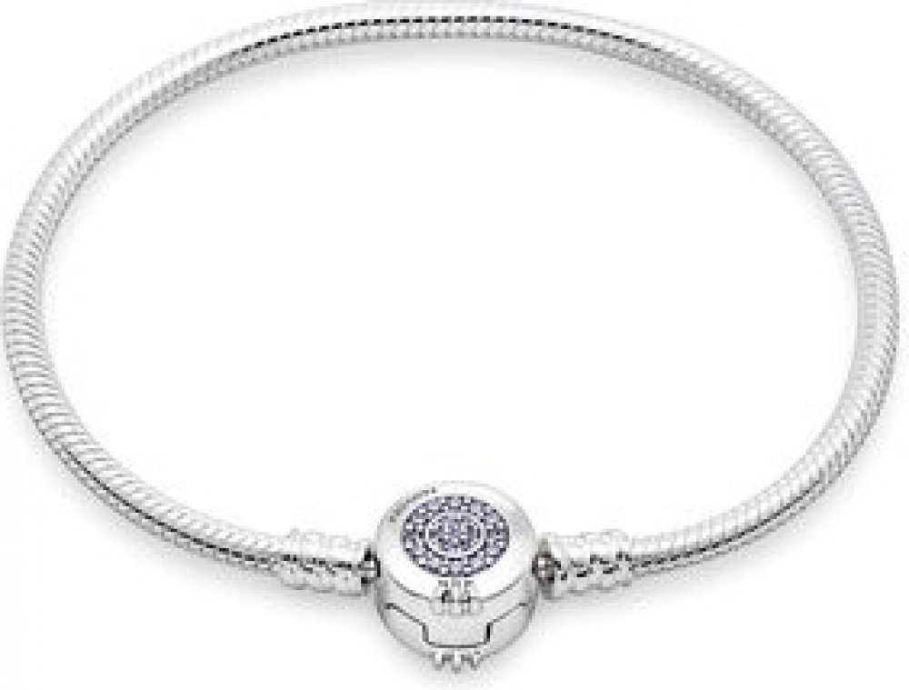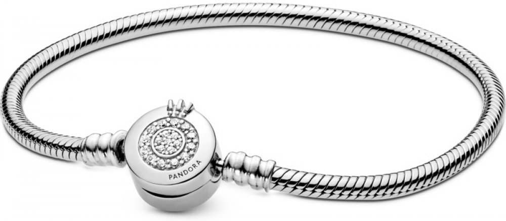pružný náramek z hadích článků ze stříbra 925/1000, leštěný hadí řetízek, tloušťka 3 mm, zapínání na kulatou sponu s třpytivými zirkony, s gravírováním loga, k obvodu ruky je třeba připočítat 2-3 cm podle počtu přívěsků Stříbrný náramek Pandora - Model: Pandora Moments, třpytivý náramek Crown O Snake Link - Číslo výrobku: 599046C01-18 - Kov: stříbro Pandora - Délka: 18 cm - Kameny: syn. kubické zi...