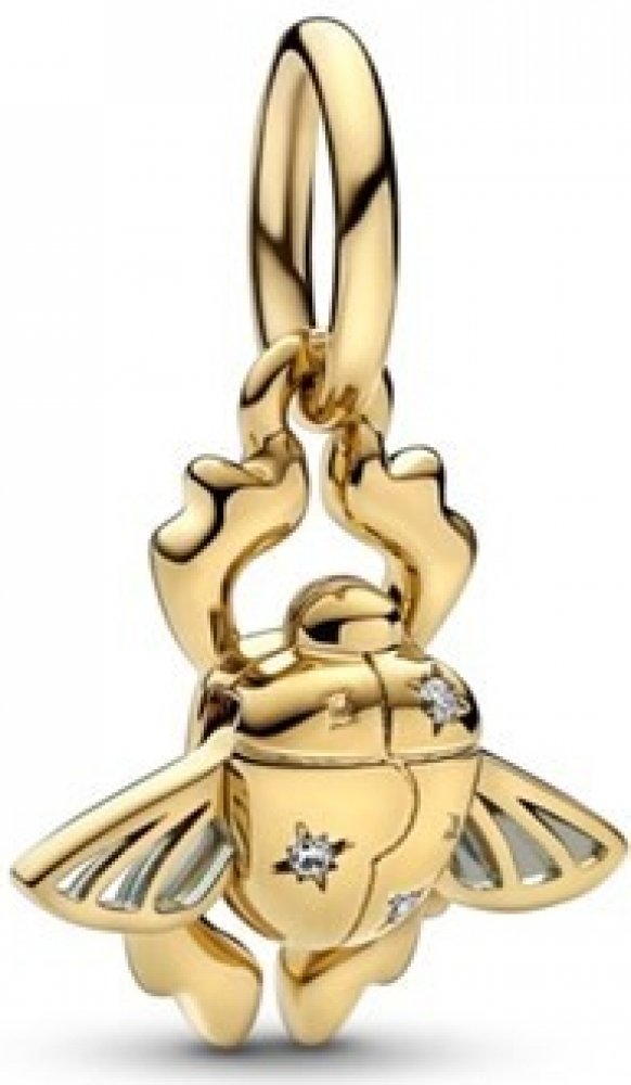 Oslavte 30. výročí Disney Aladina s Disney x Pandora. Tento přívěsek zlacený 14karátovým zlatem je inspirován zlatým skarabeem – klíčem k jeskyni pokladů s jejími nebezpečnými skvosty, kde se Aladin setkává s kobercem a nachází kouzelnou lampu. Visací přívěsek osázený kubickými zirkoniemi s kulatým briliantovým výbrusem je zakončen křídly smaltovanými technikou plique-a-jour, jež svými reálnými pohyby nahoru a dolů vytvářejí okouzlující efekt. Stylizujte tento symbolický visací přívěsek Disney Aladin, Skarabeus na svém oblíbeném nosném prvku a postavte se světu s působivými příběhy na své straně.