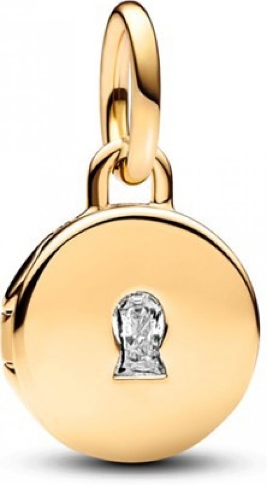 Mějte to, co je vám nejmilejší, blízko u srdce s visacím přívěskem Otevírací a gravírovatelný medailon Láska. Tento medailonový přívěsek pozlacený 14karátovým zlatem zdobí na přední straně čirá kubická zirkonie ve tvaru klíčové dírky a lze ho bezpečně otevírat a zavírat, takže uvnitř můžete mít drobný obrázek, poznámku nebo pramínek vlasů. Vnitřní strana medailonu je opatřená rytinou „TODAY TOMORROW ALWAYS“ a zadní strana je prázdná pro vlastní gravírování. Noste ho na svém náhrdelníku nebo náramku Pandora Moments jako symbol toho, že uchováváte svou lásku v bezpečí, a jako připomínku toho, že si ji musíte každý den vážit.