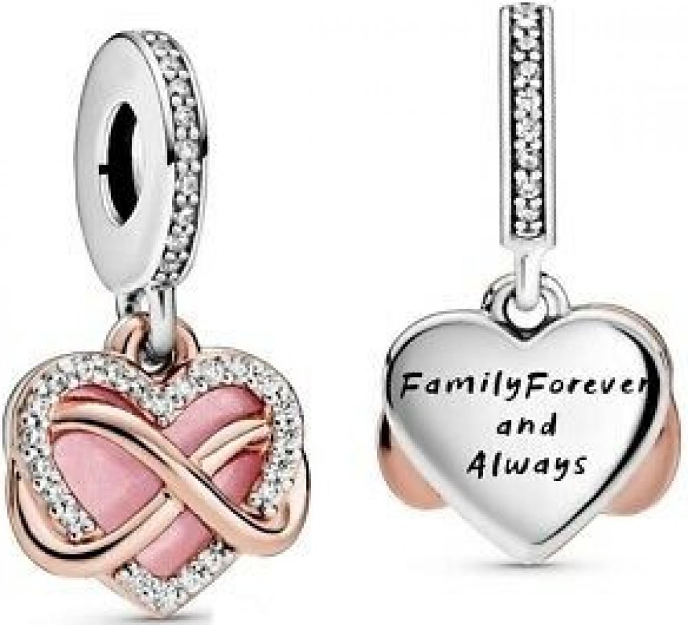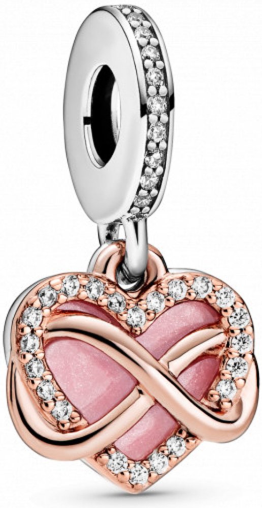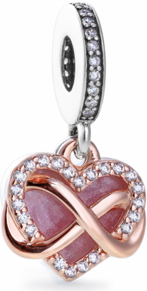 PANDORA visací korálek ve tvaru srdce se symbolem nekonečna. Korálek vyrobený v kombinaci stříbra a růžového pozlacení. Korálek je zdobený světle růžovou glazurou a čirými zirkony.
