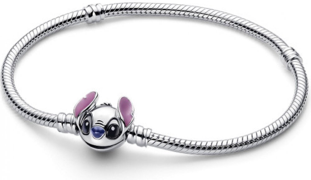 Stříbrný DISNEY X PANDORA náramek z kolekce Moments se zapínáním ve tvaru ikonické postavičky Stitch.
