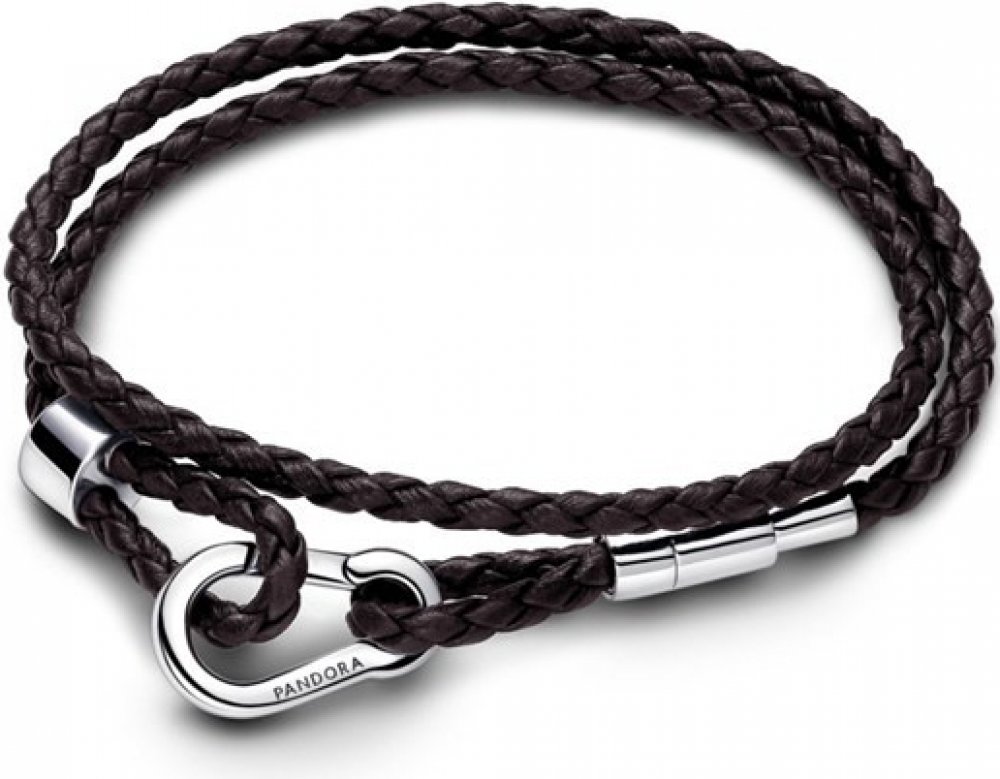 Hnědý proplétaný dvojitý kožený náramek Pandora Moments spojuje zemitost se šmrncem. Splétaná hnědá kůže je dvakrát omotaná a zapíná se stříbrnou karabinkou s vyrytým logem Pandora na obou stranách. Náramek upravíte pomocí posuvné kovové koncovky na jednom konci náramku. Pomocí otevíratelné kovové koncovky na druhém konci přidáte a upevníte přívěsky. Ozdobte si tento moderní, velmi slušivý náramek...