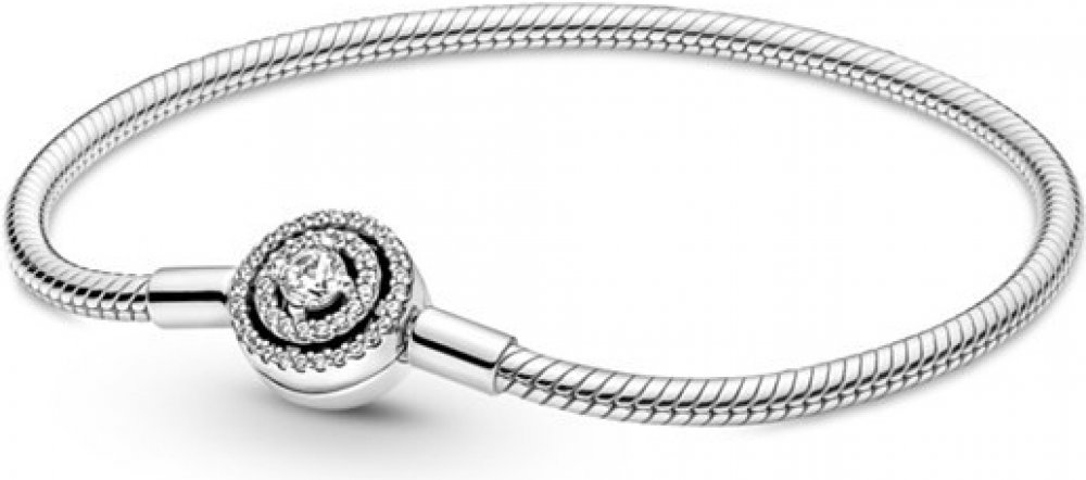Náramek PANDORA Moments Aureola si získá zaslouženou pozornost svým okázalým třpytem. Zapínání je totiž zdobeno mnoha zářivými zirkony. Hadovitý náramek už čeká na originální kombinaci korálků a přívěsků Pandora. Nezapomeňte si zvolit správnou velikost. Tento má délku 18 cm.