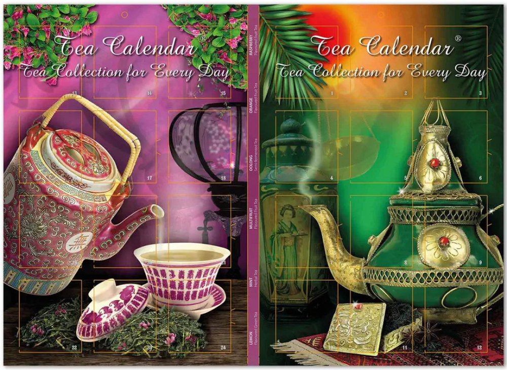Originální čajová kolekce z naší vlastní produkce ve formě oboustranného adventního kalendáře, která obsahuje 24 ks porcovaných čajů – zkušenými čajovníky z Růžové čajovny vybraný mix nejoblíbenějších ovocných, zelených, černých, bylinných a oolong čajů. Čaje jsou umístěny v jednotlivých okénkách po obou stranách kalendáře tak, aby na každý den adventu připadl jeden lahodný nápoj.