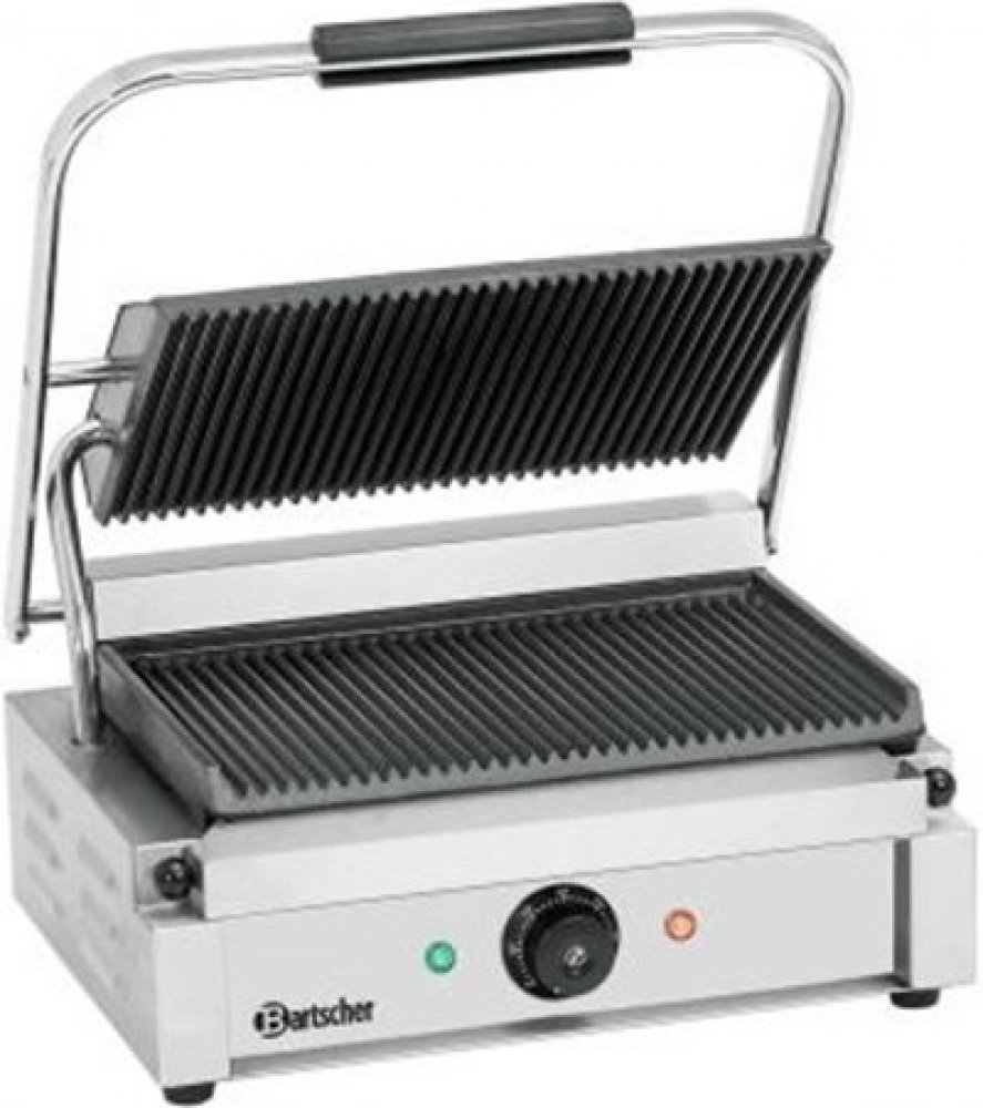 Grilovací desky rýhované. Robustní konstrukce z nerezové oceli. Litinová deska pro optimální přenos tepla. Samostatný termostat 50 až 300 °C. Kontrolka ohřevu; kontrolka zapnuto/vypnuto. Odkapávací miska. Příkon: 2,2 kW/230 V. Rozměry: 410 (Š) x 400 (H) x 200 (V) mm; rozměry horní grilovací desky: 335 (Š) x 220 (H) mm, rozměry dolní grilovací desky: 335 (Š) x 230 (H) mm. Hmotnost: 18,7 kg. Dodáváno včetně čistícího kartáče.