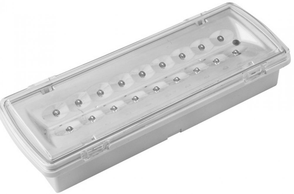 Nouzové svítidlo LED moderního vzhledu s LED indikátorem a čirým difuzorem. Výhodou svítidla je možnost částečného zapuštění nebo montáž do podhledu. Nouzová svítidla se používají ve všech veřejných budovách i větších bytových objektech, ale i v rodinných domech. V případě výpadku elektrického proudu slouží k osvětlení únikových cest. Svítidlo je dostupné s autonomií 3 hodiny a může být opatřeno samolepícím piktogramem k vyznačení směru úniku. Pracuje v nouzovém i permanentním režimu. Typ svítidla: M = Maintained - svítidlo pro trvalé nouzové osvětlení (světelný zdroj pro nouzové osvětlení je zapnut po celou dobu, po kterou je potřebné normální nebo nouzové osvětlení) Možno zapojit i jako typ svítidla: NM = Non Maintained - svítidlo pro dočasné nouzové osvětlení (světelný zdroj pro nouzové osvětlení je v činnosti pouze pokud dojde k výpadku napájení), v případě výpadku elektrického proudu slouží k osvětlení antipanických zón a únikových cest. Technické parametry Produkt - šířka (mm): 270 Produkt - výška (mm): 100 Produkt - hloubka (mm): 55 Produkt - hmotnost (kg): 0,395 Obal - šířka (mm): 280 Obal - výška (mm): 110 Obal - hloubka (mm): 60 Obal - hmotnost (kg): 0,054 Celková hmotnost produktu s obalem (kg): 0,462 Počet produktů v master cartonu (ks): 12 Kategorie: Průmyslová Materiál (základna): Plast Materiál (kryt): Plast Napájení: 230V AC Příkon (W): 3 Autonomie: 3h Světelný tok (lm): 100 Třída ochrany: 2 IP: IP65