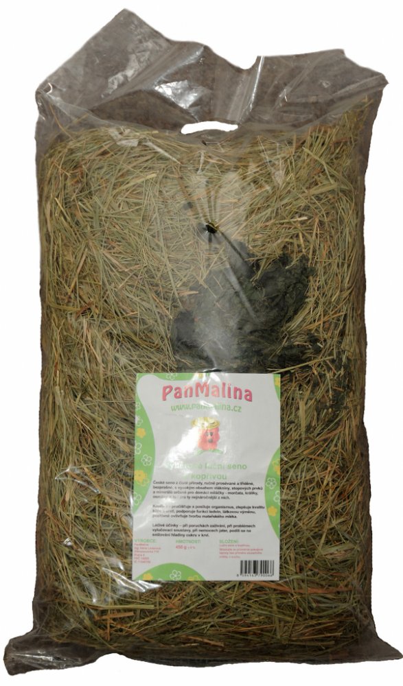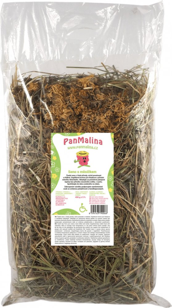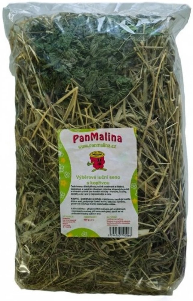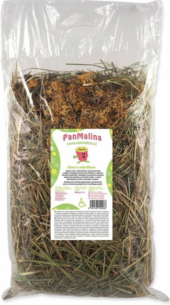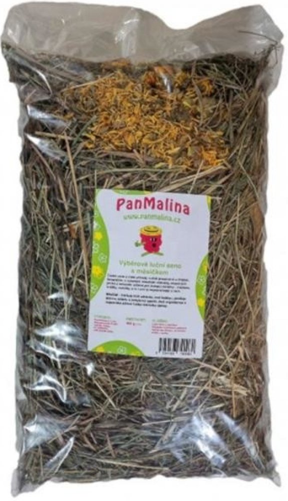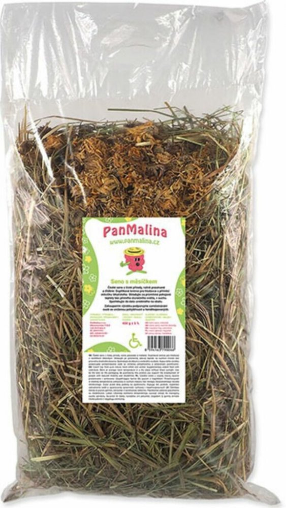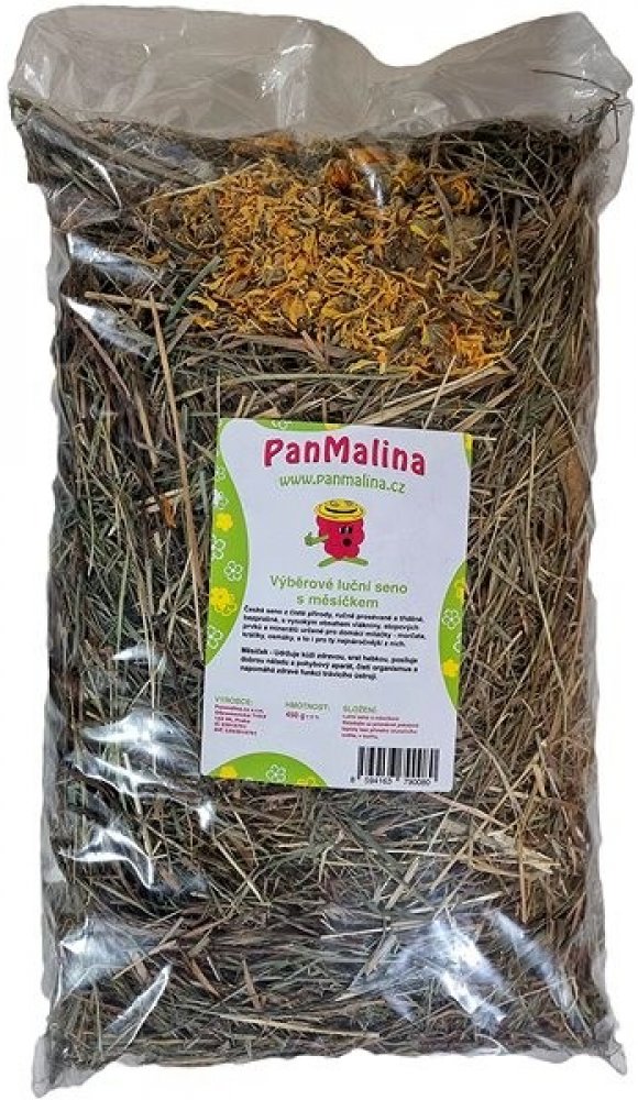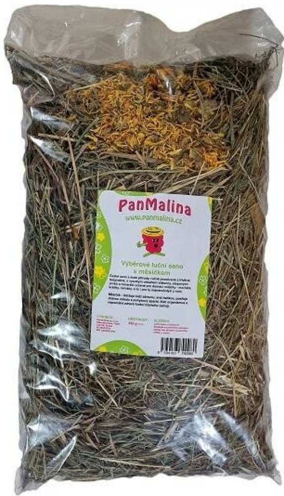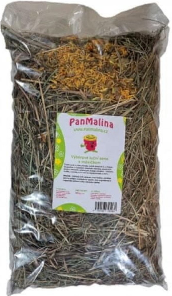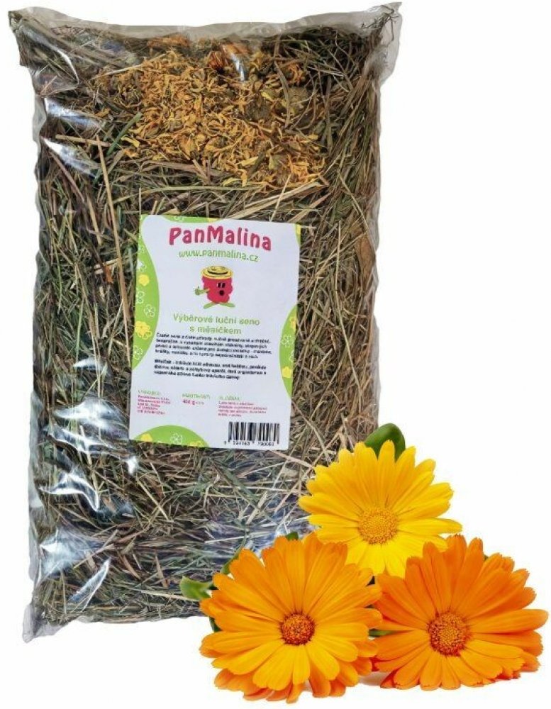 Seno Pan Malina – voňavé seno z českých luk Kvalitní ručně tříděné seno s vysokým obsahem vlákniny a minerálů, vhodné pro morčata, králíky i osmáky. Díky šetrnému prosévání je bezprašné a lehce pěchované, takže se hodí i pro ta nejcitlivější zvířata. Kvalitní seno z českých luk. Ruční prosévání a třídění zaručuje nízkou prašnost. Vysoký obsah vlákniny, stopových prvků a minerálů. Vhodné i pro nejnáročnější zvířata jako jsou morčata, králíci, osmáci a další drobní hlodavci. Je voňavé a lehce pěchované. Měsíček lékařský podporuje zdravou kůži a hebkou srst, prospívá trávení, čistí organismus a posiluje imunitu i pohybový aparát. Zároveň přispívá k celkové pohodě a vitalitě vašeho mazlíčka. Seno je chutnou a přirozenou součástí každodenního krmiva vašeho zvířete. Přirozeně obsažená vláknina napomáhá správné funkci zažívání králíků, morčat a dalších zvířat. Vláknina je také důležitá pro správný růst a obrušování zubů některých druhů zvířat, proto by jim mělo být seno neustále k dispozici. Podávejte denně jako doplněk ke kompletnímu krmivu. Vždy zajistěte zvířeti neomezený přístup k čerstvé pitné vodě. Vhodné pro každodenní krmení v neomezeném množství. Složení: luční seno, měsíček lékařský.