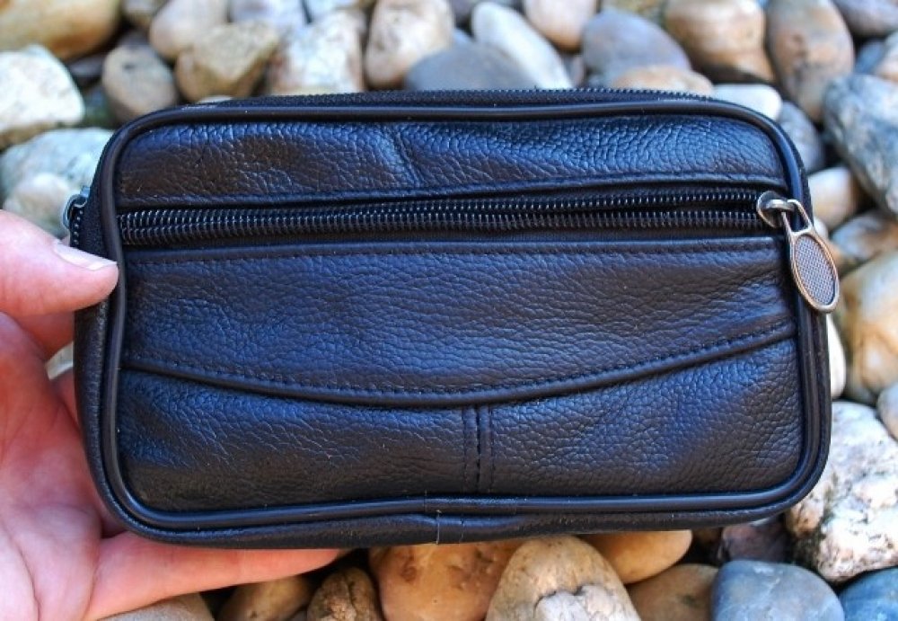 Pánská černá kožená taška zipová na opasek prošívaná priečinková