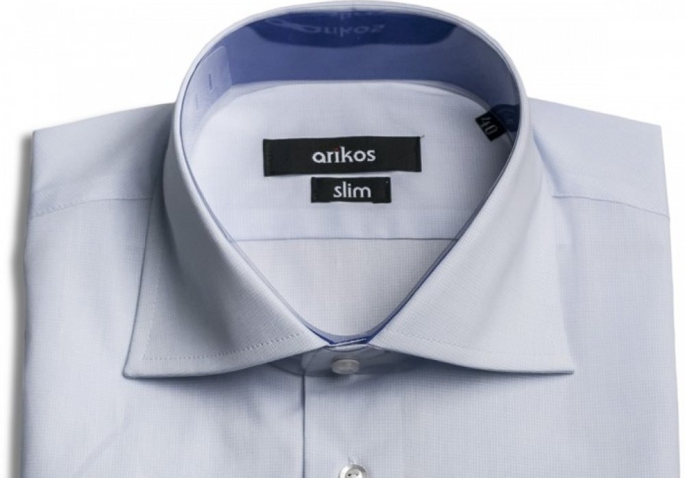 - Bílá košile s jemným bílým vzorem doplněná o tmavě modrou barvu ve vnitřním límci, zapínání a manžetě. Košile je vyrobena z lehce elastického materiálu, který ale nezabraňuje odvodu potu. Košile má klasickou manžetu na knoflíčky.