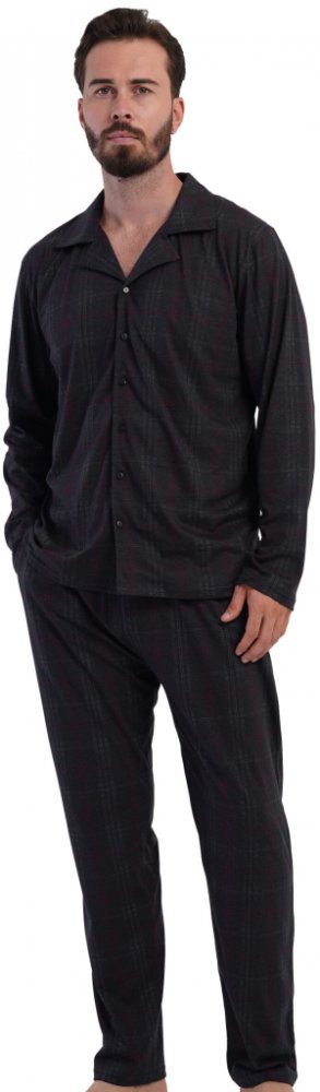 Elegantní pánské pyžamo s dlouhým rukávem a nohavicemi. Vrchní díl je celopropínací na knoflíky s klasickým límečkem, spodní kalhoty mají pohodlnou gumu v pase. Tmavě šedý podklad s jemným vínovým a světle šedým károvaným vzorem působí decentně a nadčasově. Vyrobeno ze 100% bavlny.