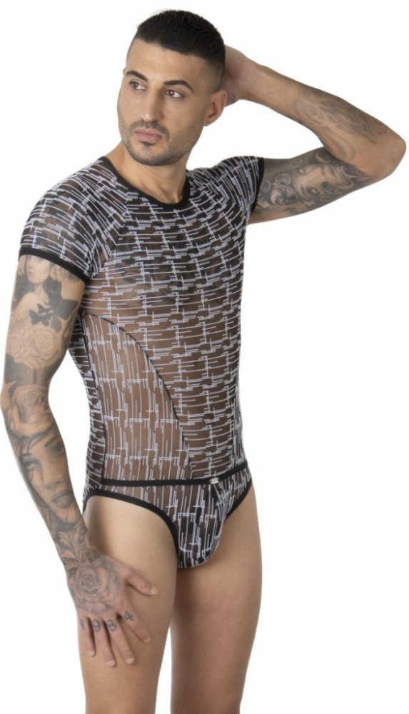 Tento model kombinuje průhlednou síťovinu s originálním grafickým potiskem, čímž vytváří výrazný a smyslný vzhled. Krátký rukáv a precizně střižený střih lichotí postavě a přirozeně zvýrazňuje siluetu.Elastický materiál se přizpůsobí tělu a zajistí pohodlí při nošeníKontrastní černé lemování podtrhuje tvar a dodává modelu šmrncPrůhledný efekt s geometrickým vzorem působí extravagantně a dráždivěIdeální pro odvážné muže, kteří se nebojí zaujmout.