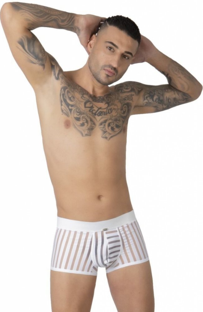 Elegantní pánské boxerky s push-up efektem, které zaujmou průhledným pruhovaným designem.Bílý transparentní materiál s vertikálními pruhy vytváří opticky štíhlejší siluetu a nechává decentně vyniknout kůži. Díky integrované push-up výztuži boxerky podtrhují mužnost a dodávají sebevědomý vzhled.Push-up efekt pro zvýraznění intimních partiíPrůhledný pruhovaný materiál s moderním vzhledemPříjemně elastický pas pro pohodlné nošeníVhodné pro odvážný každodenní styl i speciální příležitostiStylové a smyslné spodní prádlo, které zaujme z každého úhlu.