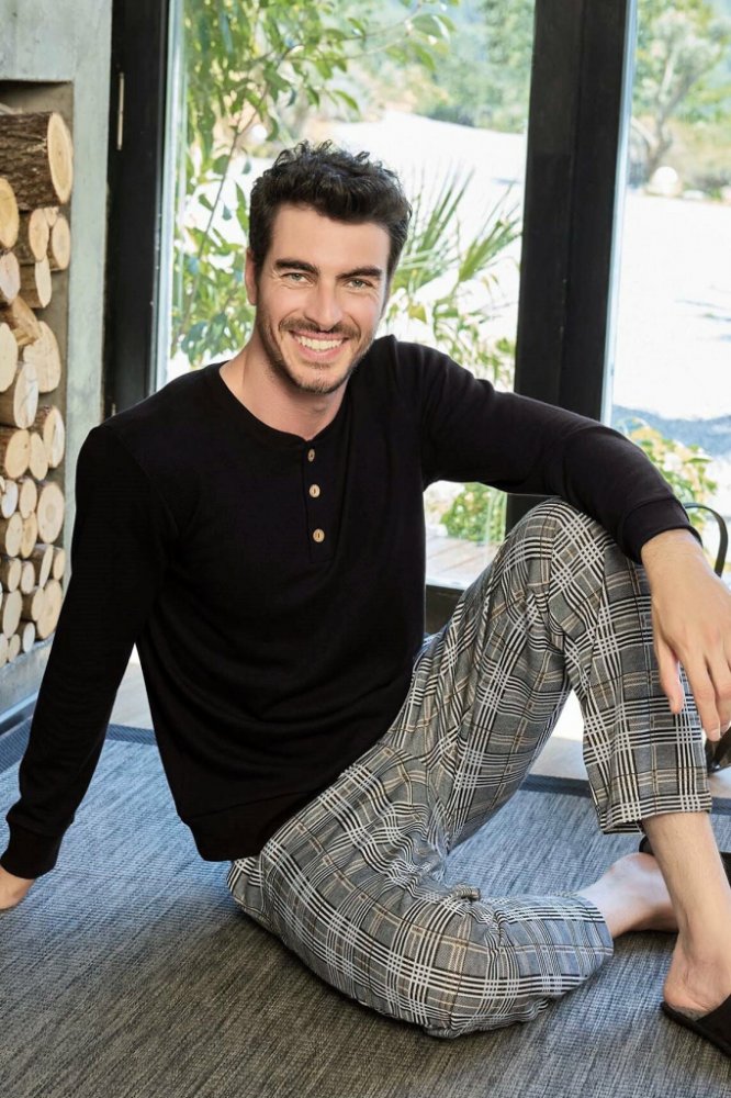 Stylové pánské pyžamo z teplého silného materiálu. Černé triko s náplety a třemi dřevěnými knoflíky u krku. Kalhoty s kapsami v moderním světle šedém a černém káru, rovné nohavice pro pohodlí.