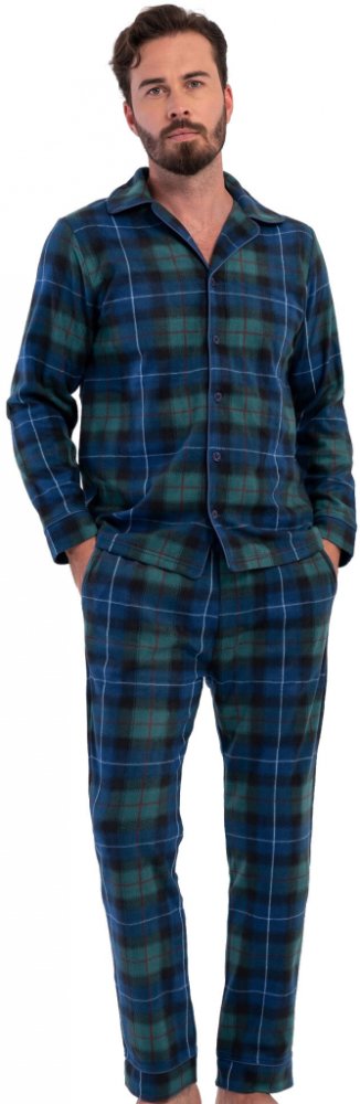 Teplé elegantní pánské pyžamo z hřejivého materiálu určené pro chladné dny, zimní spánek i domácí relax. Modrý celovzorovaný komplet se zeleným károvaným motivem má celopropínací triko s límečkem a dlouhé kalhoty se širokou gumou, šňůrkou a kapsami.