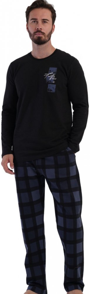 Moderní černé pánské pyžamo z teplé bavlny s počesaným vnitřkem. Triko s nápisem „Víra, zrozený k úspěchu“ doplňují tmavě modré kalhoty s jemným mřížkovaným vzorem. Elegantní, pohodlné a ideální pro chladné dny i noci.