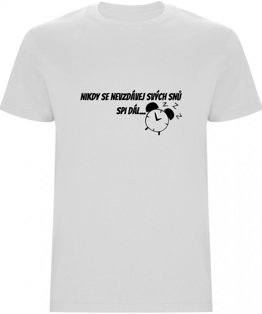 Pánské tričko s nápisem „Nikdy se nevzdávej svých snů, spi dál“ pobaví každého s citem pro humor. Vyrobené z kvalitního materiálu s odolným potiskem, který vydrží i časté praní. Skvělý tip na originální a vtipný dárek pro kamaráda, bratra nebo kolegu.