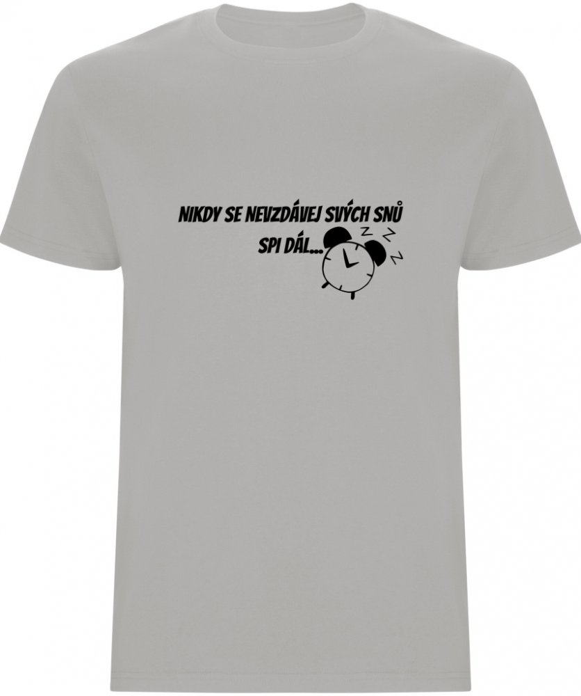 Pánské tričko s nápisem „Nikdy se nevzdávej svých snů, spi dál“ pobaví každého s citem pro humor. Vyrobené z kvalitního materiálu s odolným potiskem, který vydrží i časté praní. Skvělý tip na originální a vtipný dárek pro kamaráda, bratra nebo kolegu.