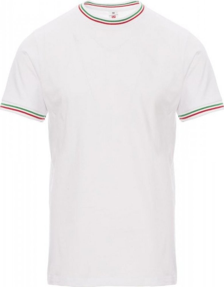 Pánské tričko s krátkým rukávem a kulatým výstřihem, límeček a lem rukávu s kontrastní italskou trikolórou, 2,3 cm pružný žebrovaný lem ze směsi spandex u krku s vrchním prošíváním na přední straně, vyztužovací páska od ramene k rameni viditelná na límečku, pružné švy, postranní sešití.