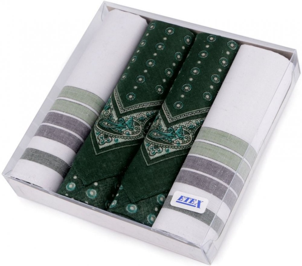 Sada velkých elegantních kapesníků v krabičce s transparentním víkem je vhodná pro všechny muže gentlemany. Mohou vám posloužit jako hodnotný dárek. Jsou ideální volbou pro každodenní použití i speciální události. Jsou velice kvalitní, oceníte jejich jemnost i dlouhou životnost.