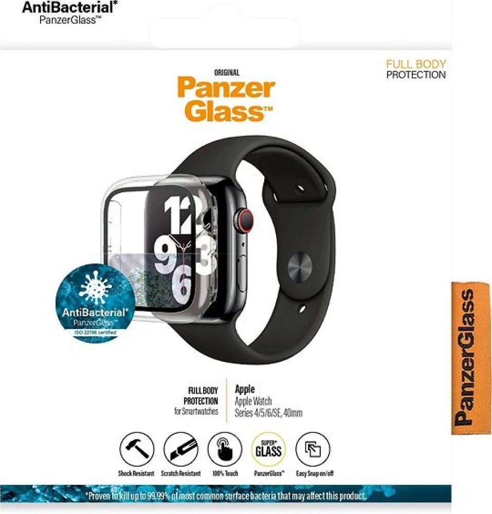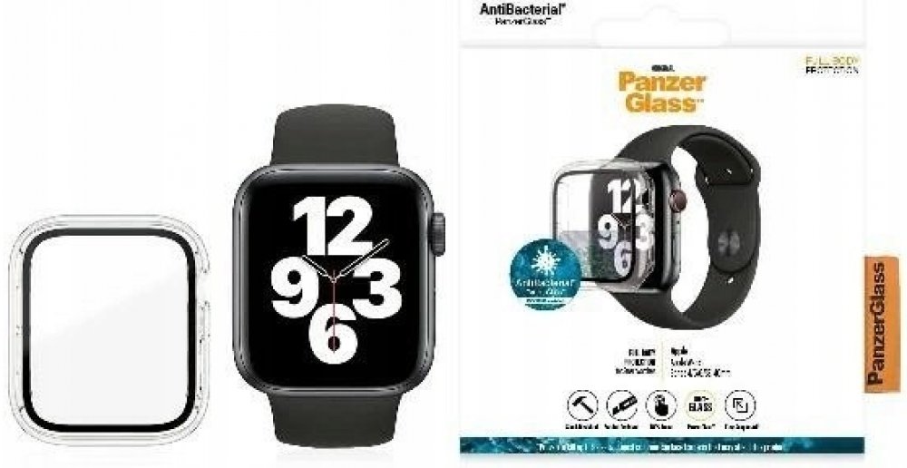 PanzerGlass ™ Full Protection pro Apple Watch Series 4/5/6/SE Vám poskytuje křišťálově čistou ochranu celého displeje i těla hodinek, aniž by byla jakkoliv omezena citlivost na dotyk hodinek. Sklo je odolné proti nárazům a vodě a je potaženo oleofobní vrstvou, která zvyšuje odolnosti proti otiskům prstů a zároveň poskytuje antibakteriální ochranu proti bakteriím. Bočnice ochranného krytu jsou z velmi odolného plastu. Jakmile uslyšíte "click" je nasazen.