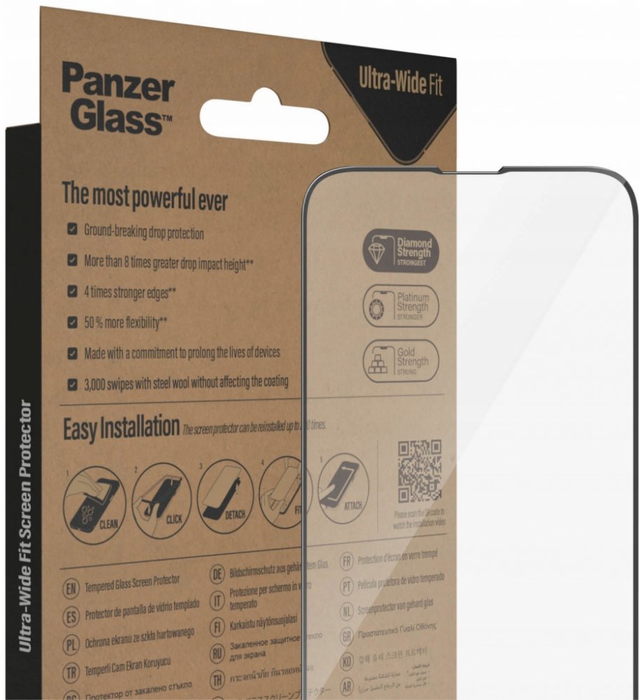 Ultra-Wide Fit - označení pro rozšíření ochranného sklíčka PanzerGlass s černým rámečkem.