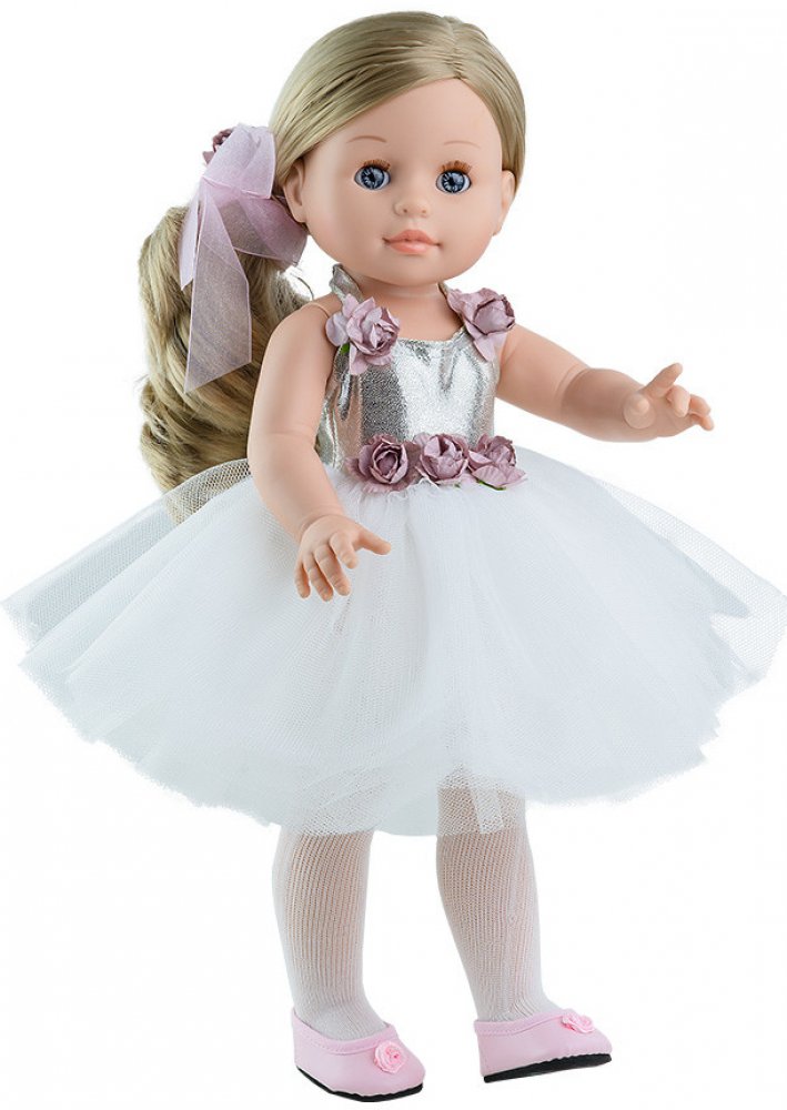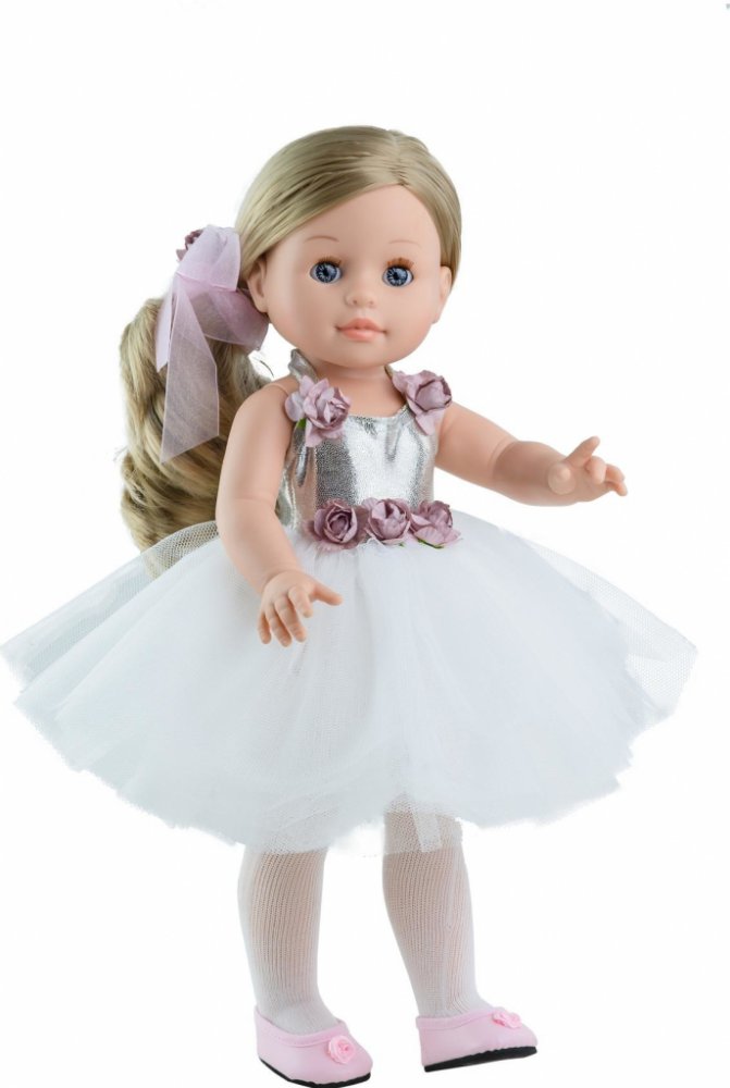 Emma baletka je realistická mrkací panenka z kolekce Soy Tú od firmy Paola Reina ze Španělska. Baletka je 42 cm vysoká, vyrobená z kvalitního vinylu a má krásné dlouhé blond vlasy učesané na patku a svázané mašlí do culíku. Je oblečená do baletních šatiček s bílou nařasenou sukýnkou a blýskavým stříbrným živůtkem ozdobeným růžovými květy. Na nohou má Emma bílé punčochy a nízké růžové boty s kytičk...