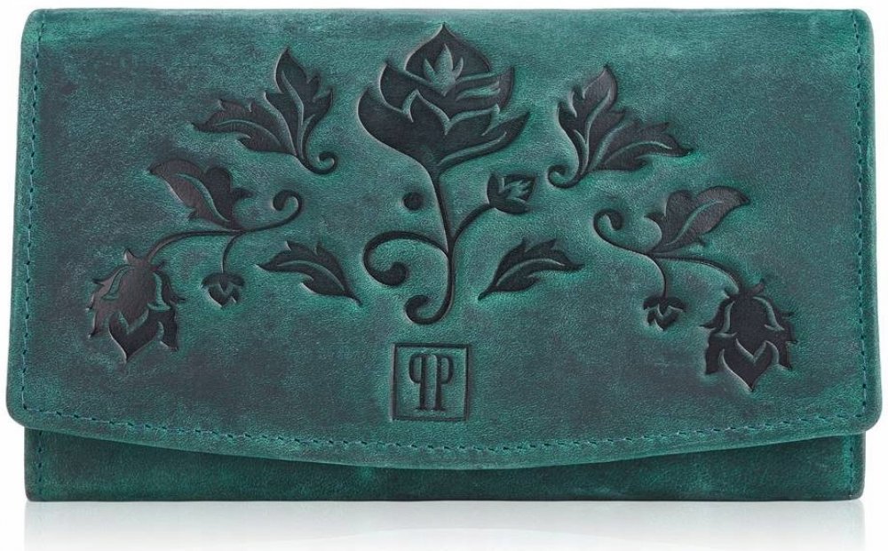 Paolo Peruzzi Dámská kožená peněženka zelená s květinovým vzorem RFID Vintage