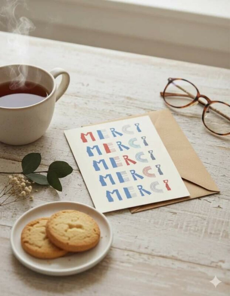 Nadčasový, minimalistický motiv „Merci“ pro univerzální použití.