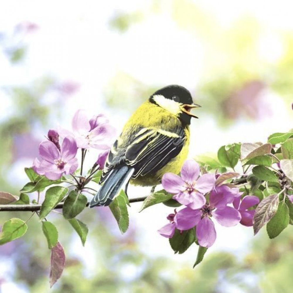 Klíčová slova: květiny, ptáček, pták, větvička, kvetoucí větev, rostliny, tráva, květy, váza, ubrousky, ruční práce, decoupage, slavnostní nebo svatební tabule, ubrousky s potiskem, ubrousky s motivem, decoupage, ubrousková technika.