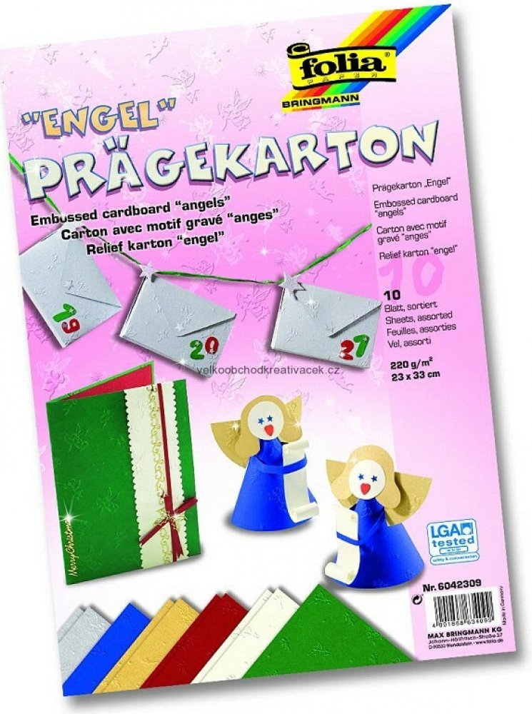 Jedná se o papír o gramáži 220 g / m2, na kterém jsou vytlačeny motivy andělíčků. Rozměr: 23 x 33 cm Balení obsahuje: 10 listů v 6ti barvách (perlová bílá, tmavě červená, modrá, zelená, stříbrná, zlatá) Papír je nádherný, je testován na nezávadnost LGA tested. Využití je rozsáhlé.. tento motiv je hojně využíván na výrobu např. přání, vizitek, pozvánek, různých závěsných dekorací, vánočních ozdobiček...