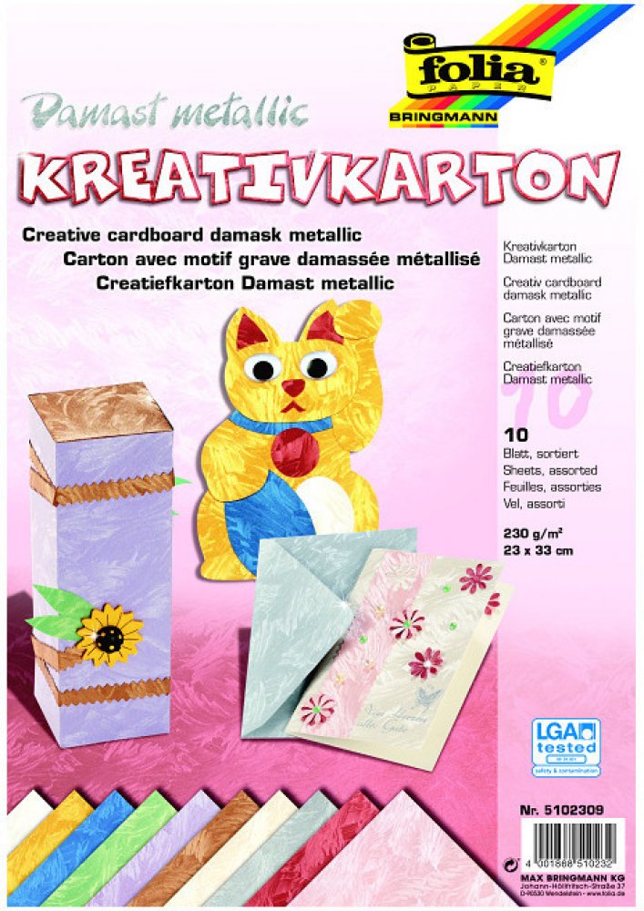 Kvalitní karton, který má z jedné strany zajímavou strukturu v metalickém provedení. Celkem 10 ks kartonů a deseti barevných odstínech. Barvy šedá, růžová, lila, krémová, zelená, hnědá, perlově bílá, žlutá, vínová, modrá. Velikost papíru 33 x 23 cm. K výrobě přáníček, krabiček, obálek apod. Gramáž 230g / m2.