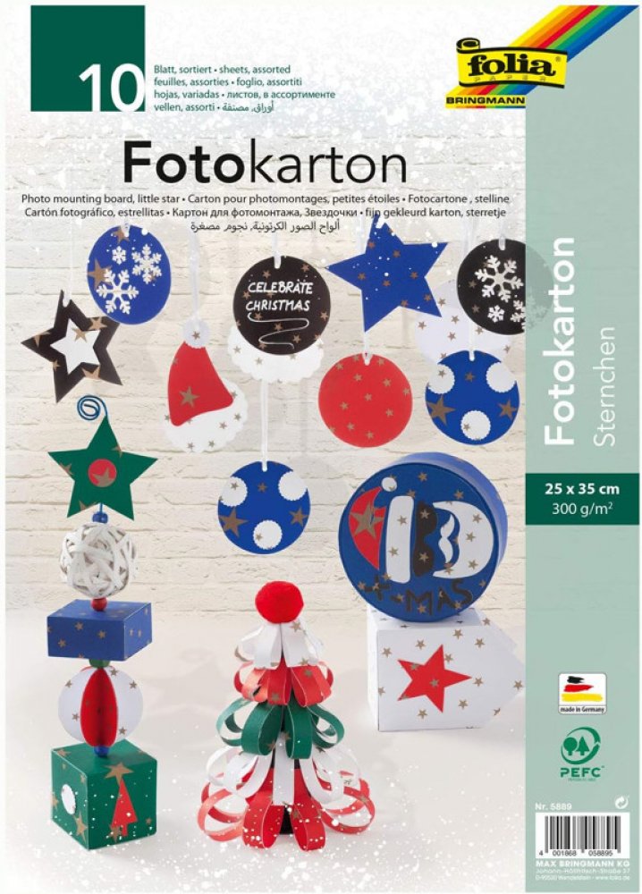 Barevné kartony s potiskem zlaté hvězdy. Z jedné strany větší a z druhé menší natisknuté zlaté hvězdičky. 10 ks v balení - 5 barev - červená, bílá, zelená, modrá, černá. Gramáž 300 g/m2. Rozměr: 25 × 35 cm.