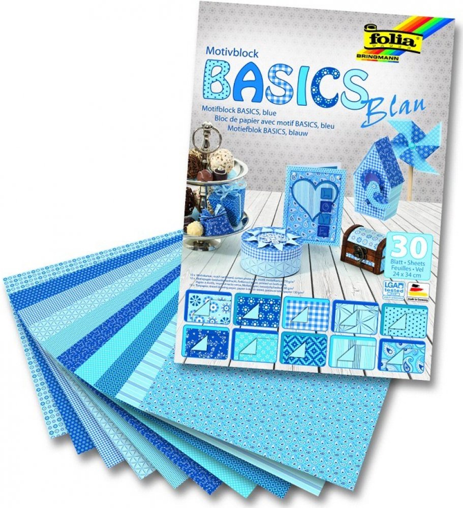Blok s papíry "Basics" - designové papíry v krásných motivech. Blok obsahuje - 30 papírů: 10 archů kartonu s motivem 270 g / m2 v 10ti motivech 10 archů papíru s motivem 80 g / m2 v 10ti motivech 10 archů barevného papíru 130 g / m2 v různých odstínech modré barvy. Rozměr: 24 x 34 cm.