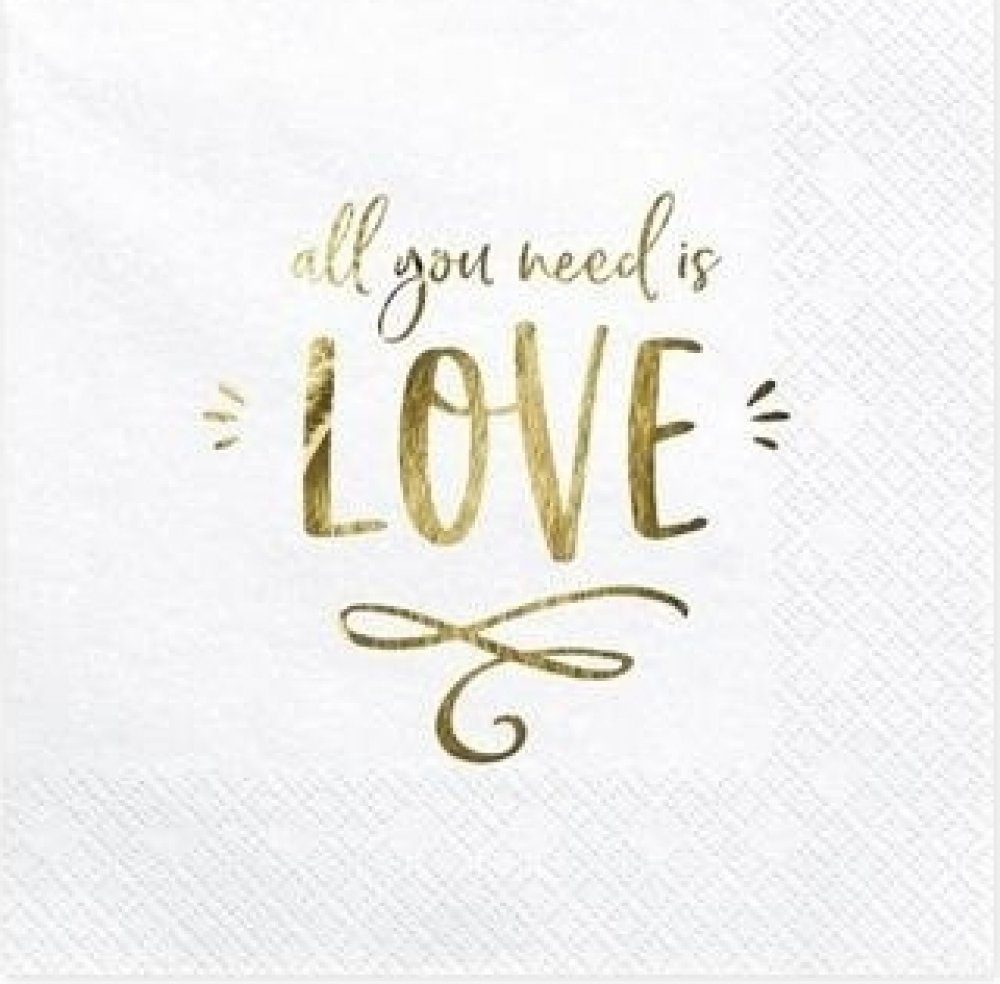 Papírové ubrousky s nápisem All you need is love vhodné na svatební dekoraci stolu a další akce. Ubrousky jsou také ekologicky šetrné a biologicky odbouratelné, což je činí perfektním doplňkem pro vaši party.