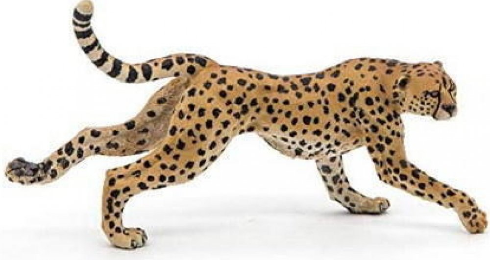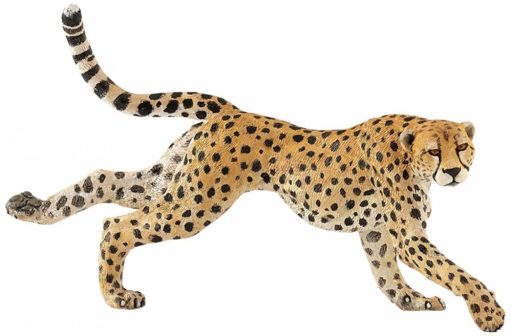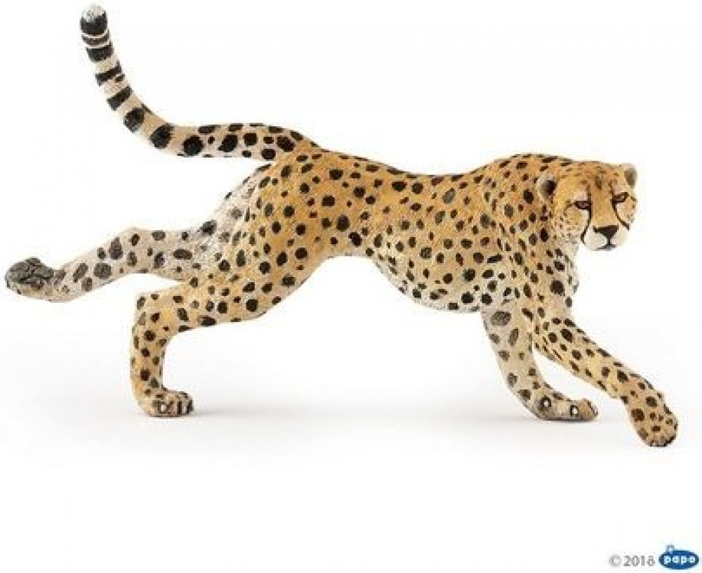 Gepard žijící v Africe a některých částech Středního východu je poměrně velkým savcem z čeledi kočkovitých šelem. Rozpoznatelný podle krátkého čenichu, dvou černých stop začínajících od očí a plavé srsti strakaté béžové je dnes nejrychlejším suchozemským zvířetem na světě s rychlostí až 115 km/h. Po 90 až 95 dnech březosti se mláďata gepardů narodí, váží 300 až 500 g a mají hřívu podél zad, která jim umožňuje maskovat se v trávě. Po 3 měsících zmizí. Délka-12,5 cm, Šířka-3,5 cm, Výška-6,8 cm, Hmotnost-0,036 kg