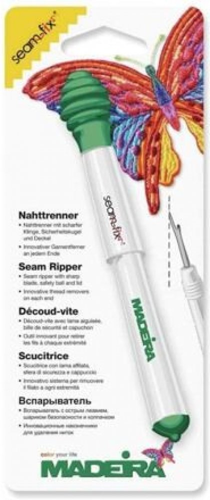 Páradlo švů s gumováním nití SeamFix - Madeira Odstraňujte švy jednoduše a snadno. S páradlem švů Madeira to snadno opravdu půjde. Páráček je šikovná pomůcka pro rychlé a přesné vypárání švů. Páradlo švů Madeira má čepel z vysoce kvalitní oceli a uzavírací kryt pro Vaše bezpečí. Jednou stranou párače vypářete švy a druhou stranou zbavíte látku již vypáraných nitek. Jednodušší už to být nemůže. Nep...