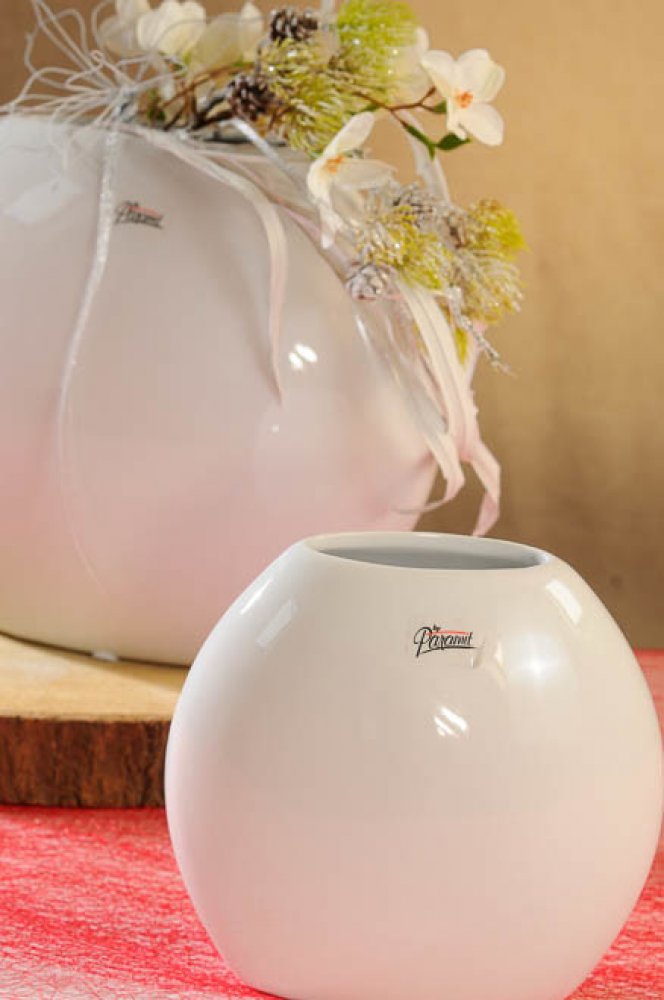 Porcelánová váza LENTILKY o průměru 16 cm ve tvaru připomínající lentilku s krásně lesklou bílou a pevnou glazuru, která nepropouští vodu. Naspod vázy jsou nalepena filcová kolečka, která zabraňují poškrábání nábytku. Vázička se hodí do každého interiéru.