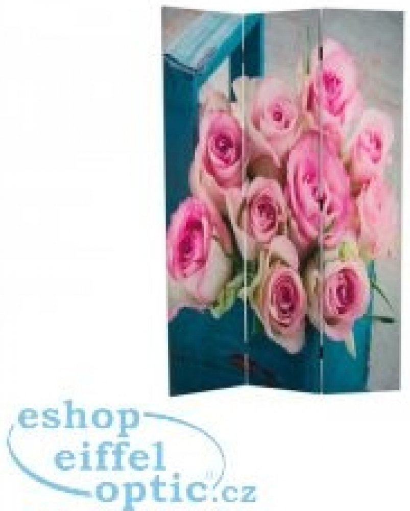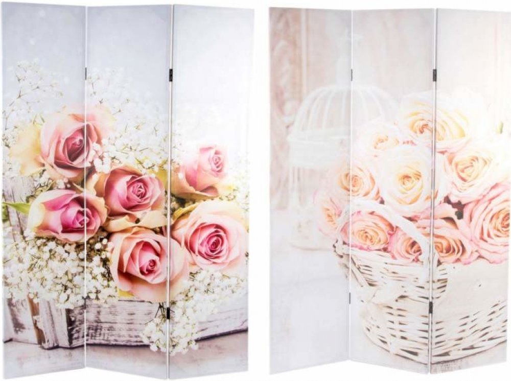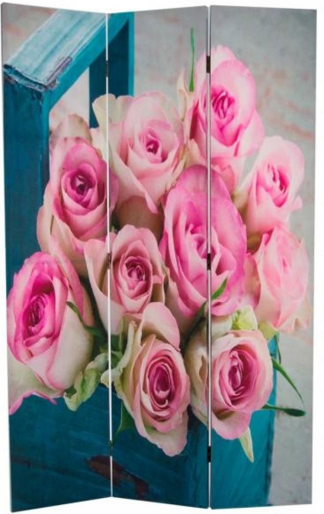 3-dílný oboustranný paravan s dekorem kytice nádherných růžových růží v modré dřevěné přepravce doladí každý interiér. Neplní jen funkci vkusného bytového doplňku, ale poslouží i jako naprosto praktická zástěna. Navíc jej lze použít i jako dělící příčku v bytě, kanceláři, restauraci, kavárně , květinářství či hotelu. Materiál: dřevěný rám, potištěné plátno.