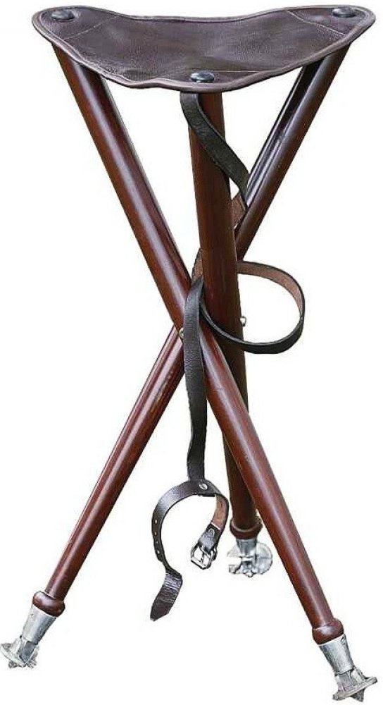 Židle trojnožka s kovovými hroty - 60 cm, hnědá Vysoce kvalitní, robustní zpracování s lemováním ze syntetické kůže na sedadle z buvolí kůže. Sedadlo je připevněno hřebíky / nýty. Dřevo stativu je cedrové. Výška sedadla: 60 cm Nosnost: do cca 110 kg Hmotnost: 1,9 kg Ideální společník pro lov Velmi robustní Včetně koženého řemínku