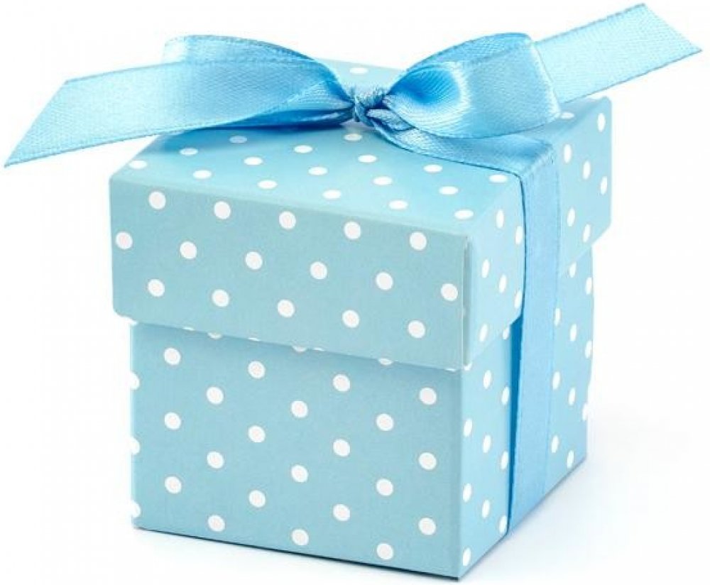 Krabička pro hosty s víčkem a stužkou ve světle modré barvě s bílými puntíky, krabička po složení má rozměry: 5,2*5,2 cm. Nápaditá a velice pěkná dekorace na svatební tabuli. Do krabičky můžete dát drobný dárek (pralinku, malou čokoládku, svatební mandle), ke krabičce připněte jednoduchou jmenovku se jménem svatebního hosta a vytvořte tak originální a pěknou jmenovku na svatební tabuli.