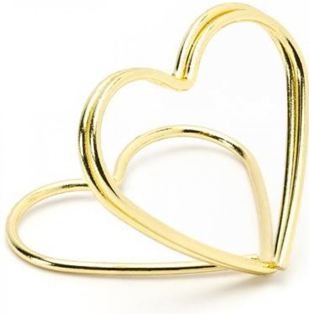 Krásné stojánky ve tvaru srdce ve zlaté barvě na svatební stoly. Jsou velmi snadno použitelné - stačí otevřít okraje srdce a vložit kartičku se jménem. Díky kovu jsou velmi stabilní a vypadají elegantně na svatební tabuli.